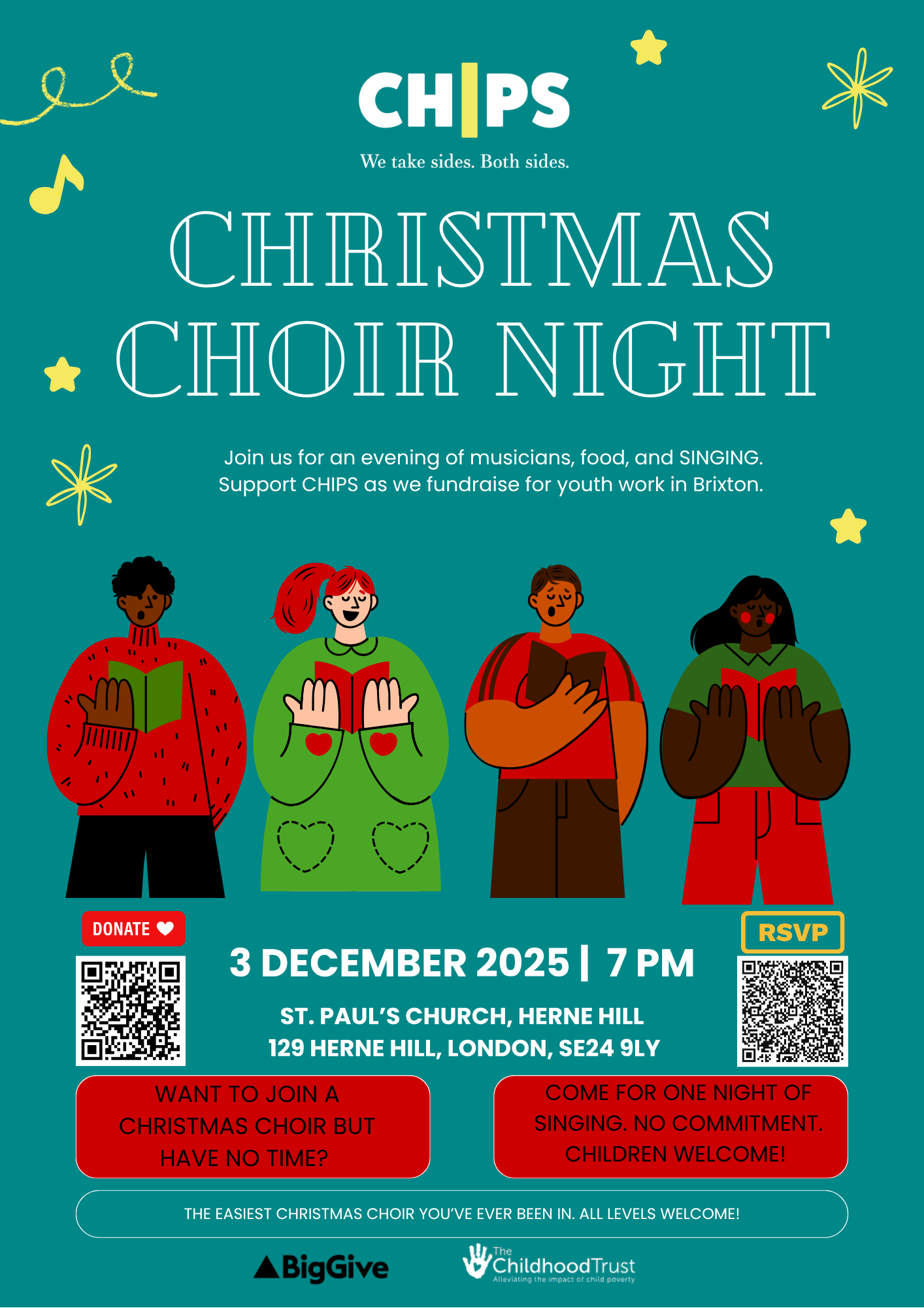 The event is free, though if you attend, we ask that you kindly donate to the Big Give Christmas Campaign, which will support another year of CHIPS' work in Brixton. Your donation will be doubled during the Big Give Campaign, 2 - 9 December. Your £1 becomes £2.